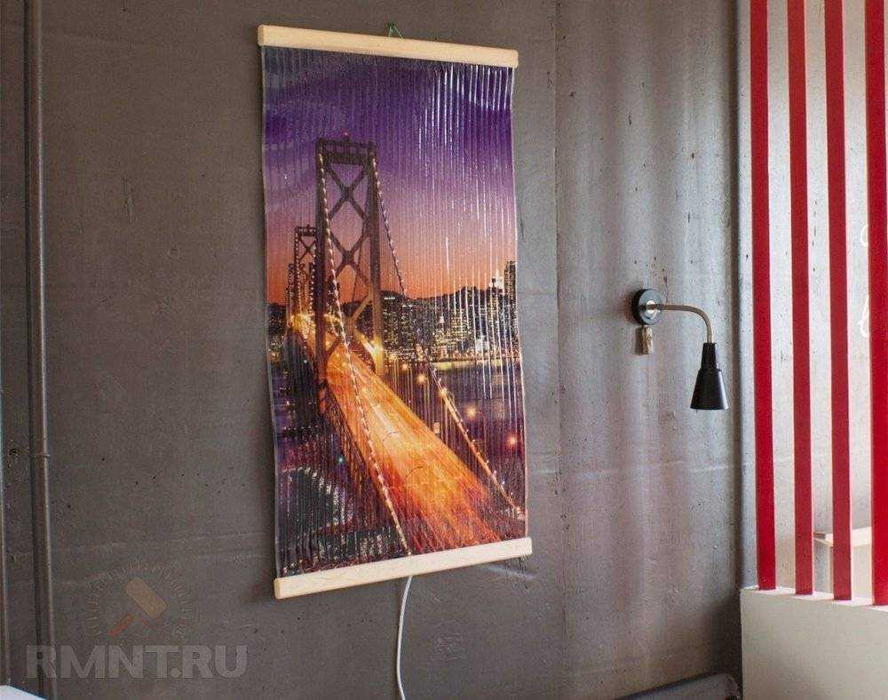 Обогреватель-картина — это, собственно, декоративное панно, на которое может быть нанесено любое изображение. Обогреватель плоский, по толщине действительно аналогичен обычному полотну — от 1 до максимум 8 миллиметров, чаще порядка 3. Несмотря на такую небольшую толщину, внутри картины помещаются карбоновые нагревательные элементы — углеродистые волокнистые нити.