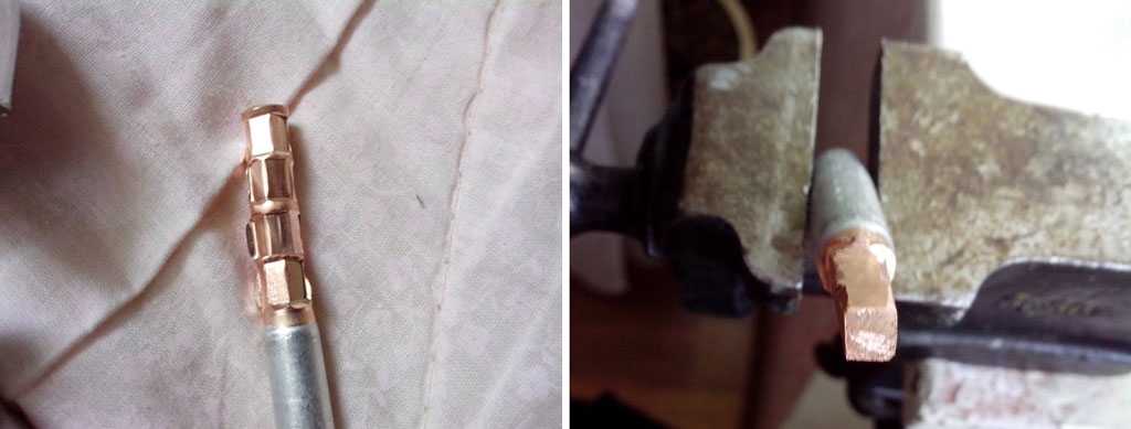 Гильза распиливается пополам. Трех сантиметров вполне достаточно чтобы сделать хороший контакт. Затем она зажимается в тисках и сплющивается один из ее концов. Делается конструкция наподобие плоского наконечника.