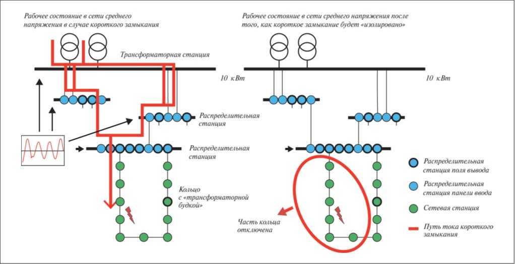 На рис. 5 приведена типичная структура сети среднего напряжения. Известные трансформаторные будки/местные распределительные подстанции (зеленые точки) соединены друг с другом по кольцу и подключены к распределительной станции (синие точки). В кольце всегда имеется разрыв (см. кольцо из зеленых точек справа снизу). При возникновении короткого замыкания по цепи протекает ток короткого замыкания (красная линия). Он протекает до тех пор, пока предохранитель на распределительной станции не отключит кольцо. Это показано на левом рисунке (в кольце слева вверху).