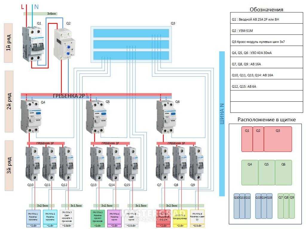 На рисунке вверху приведен монтаж автоматов защиты в электрощите современной квартиры.