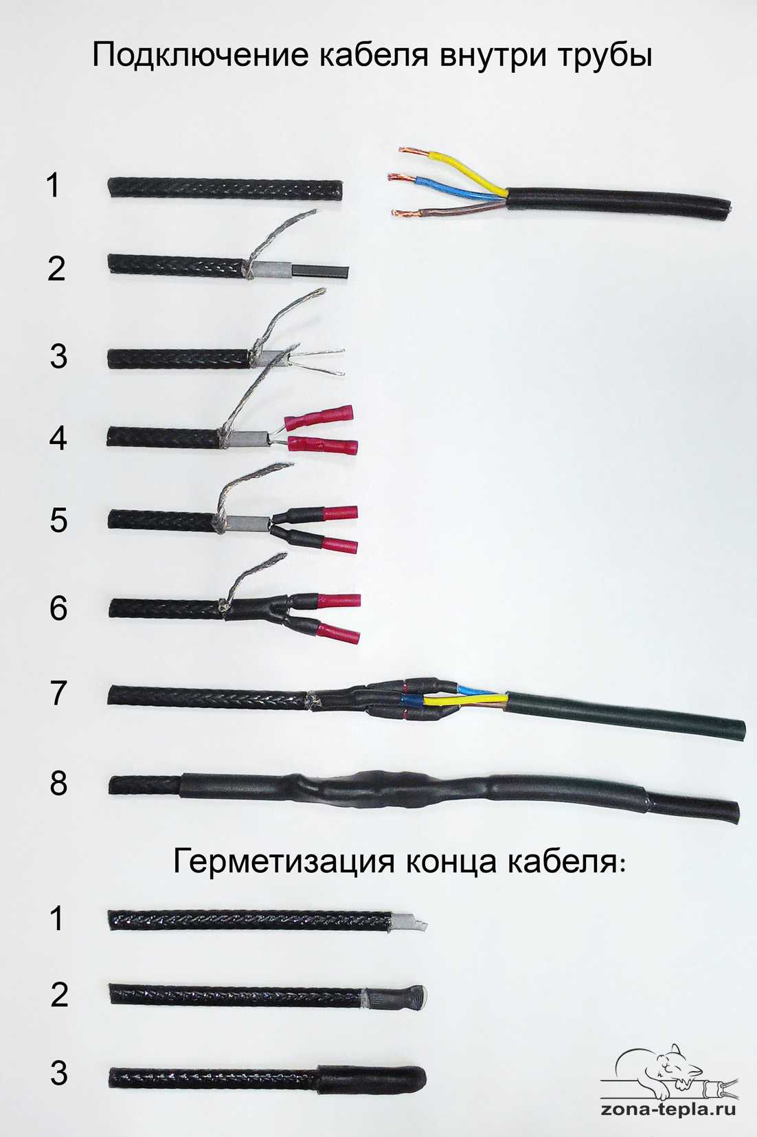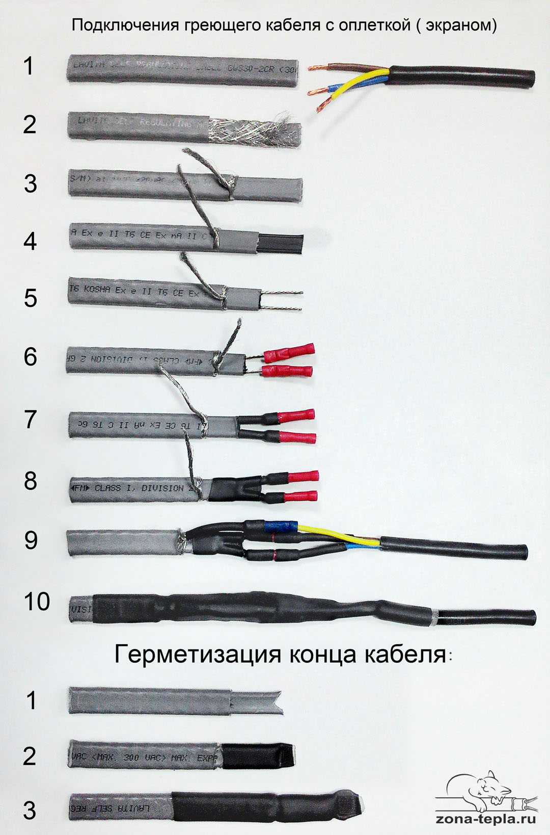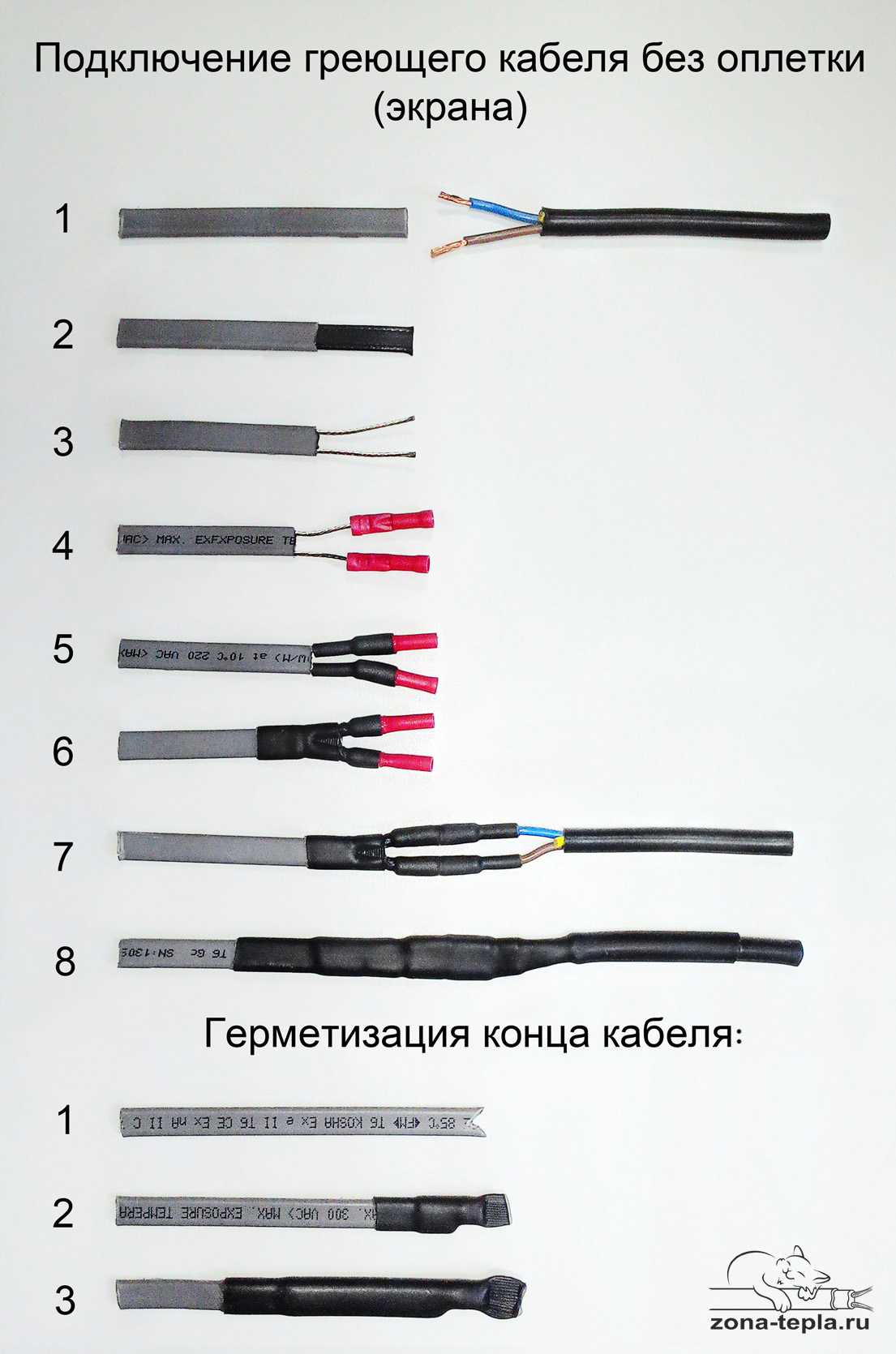 Ответы на вопросы: как разделать кабель, сколько сантиметров изоляции снимать, на какую длину зачищать проводящие жилы, как изолировать зависят от того, каким способом будем подключать. Подробную схему подключения с помощью клеевого комплекта для заделки саморегулирующихся кабелей можно посмотреть ЗДЕСЬ.