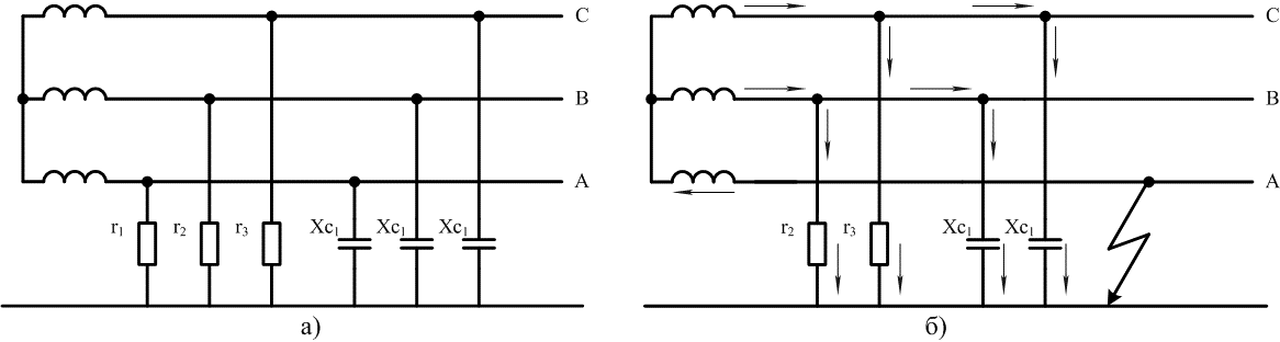 Рисунок 1 – Схема сети с изолированной нейтралью а) в нормальном режиме; б) при ОЗЗ Такое повреждение не требует немедленного отключения, однако, его длительное воздействие может привести к развитию аварийной ситуации. Однако при ОЗЗ в сетях с изолированной нейтралью происходят процессы, влияющие на режим работы электрической сети в целом.
