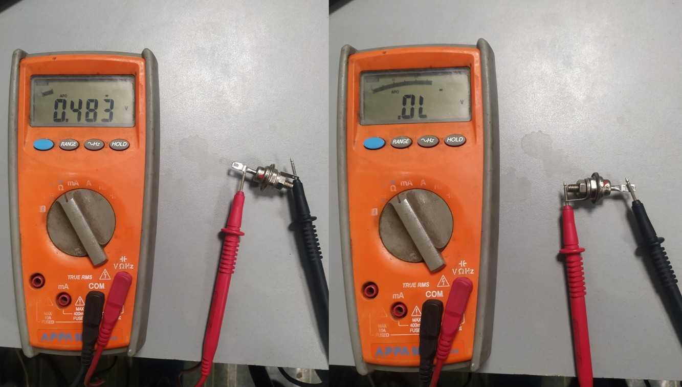 Прозвонка диода в прямом (слева) и обратном (справа) направлении.