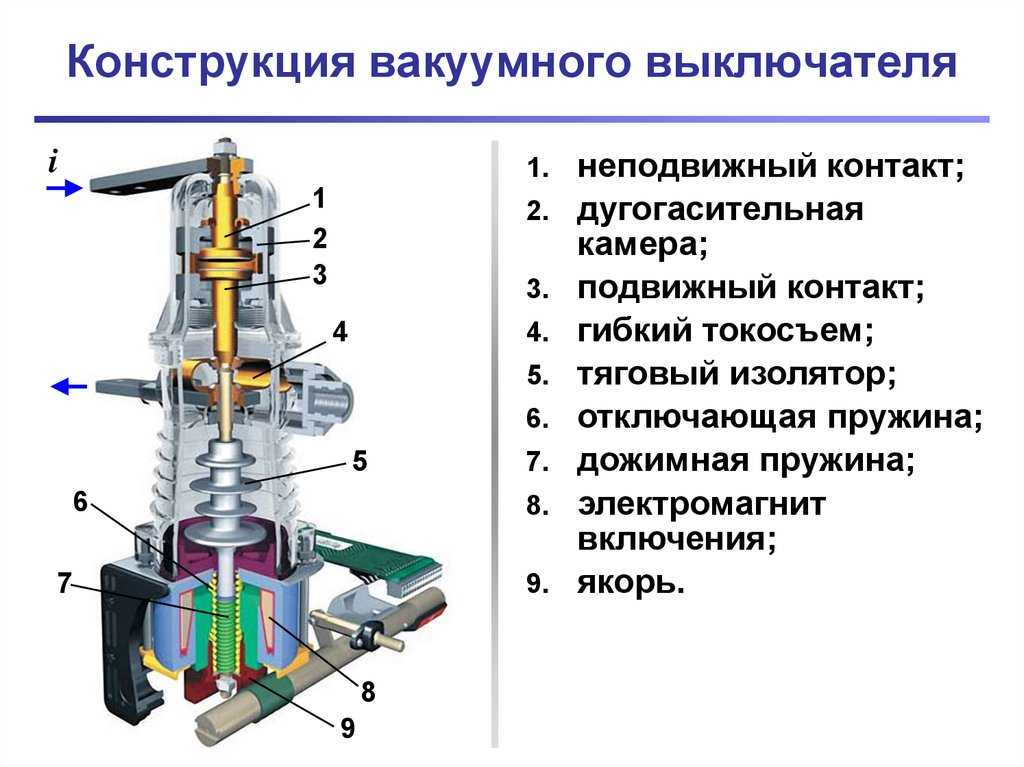 Очень эффективное, но дорогое устройство, позволяющее выключать не только номинальные токи нагрузки, но и сверхтоки при КЗ. Контакты вакуумных выключателей находятся в вакуумной камере со сверхнизким давлением (порядка 10-6 — 10-8 Н/м). Отсутствие газа создаёт очень большое сопротивление, что препятствует горению дуги.