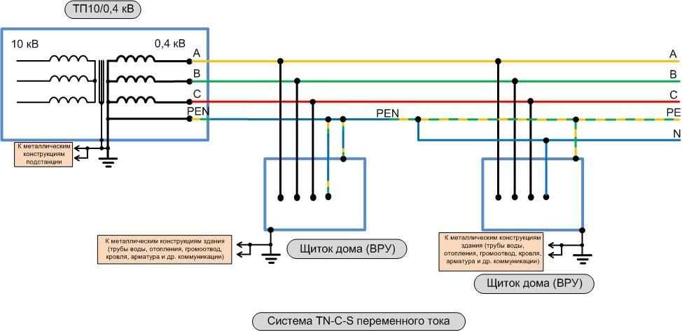 Когда используется данная схема заземления, фаза и совмещенный проводник (PEN, ноль с землей) вместе проводятся непосредственно к вводному щитку.