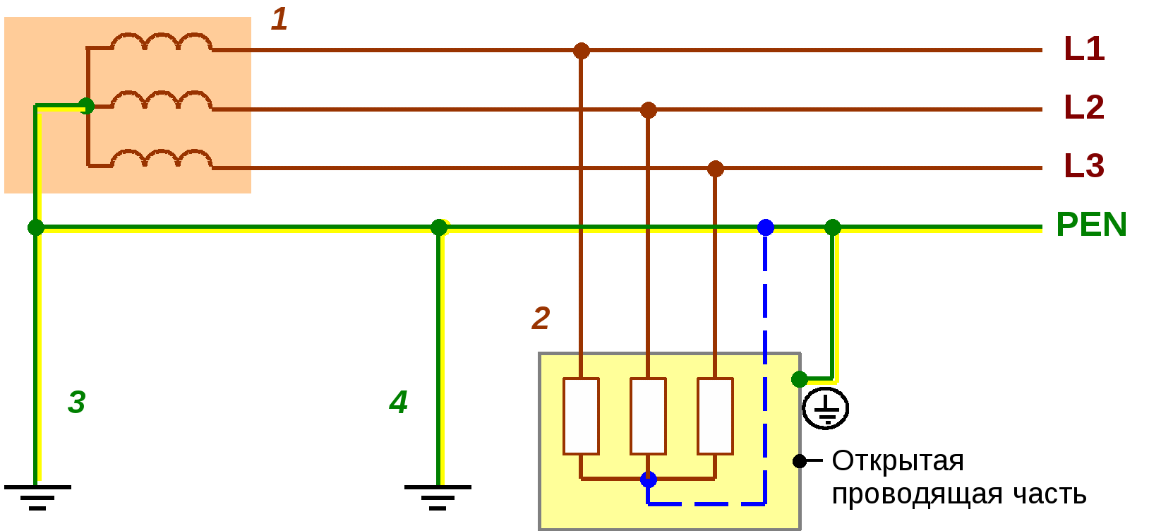 В конфигурации TN-C запрещено использовать нулевой провод в качестве элемента, заземляющего всю сеть. Несоблюдение данного правила приведет к тому, что фаза перейдет на все подключенные электроприборы. Кроме того, при обрыве проводника PEN, под напряжением окажутся заземляющие элементы сети.